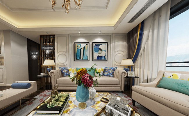 因?yàn)楣ぷ鞯奶厥庑?,面對單色調(diào)毫無喜感。所以空間配色及造型選用飽和度較高的美式田園為主。輔以寓意良好的弧線型設(shè)計(jì),讓空間倍感溫馨親切。