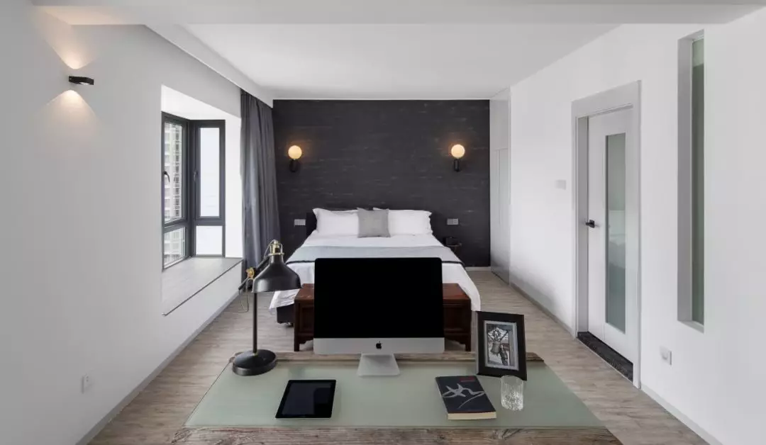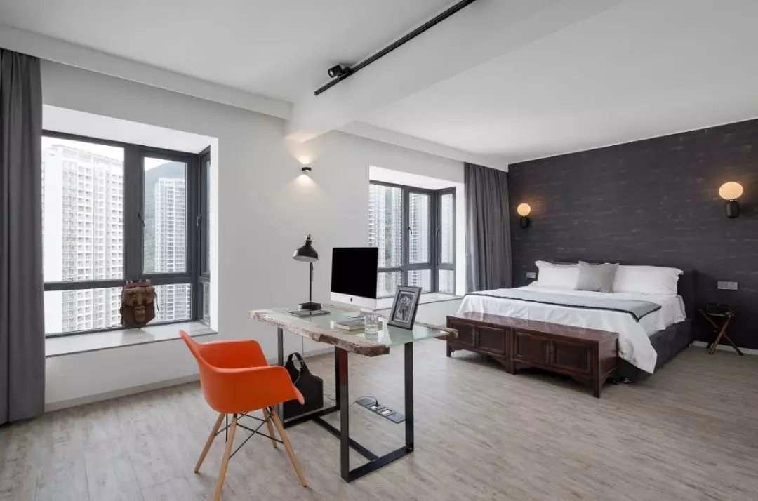三房改造兩房,讓空間利用得更加清逸自如。臥室同樣承襲了LOFT工業(yè)風(fēng)精簡、藝術(shù)的基因,感覺像是被雕刻著用刻刀剔除所有的不必要,簡約的天花,消除建筑建構(gòu)給人的壓迫感。