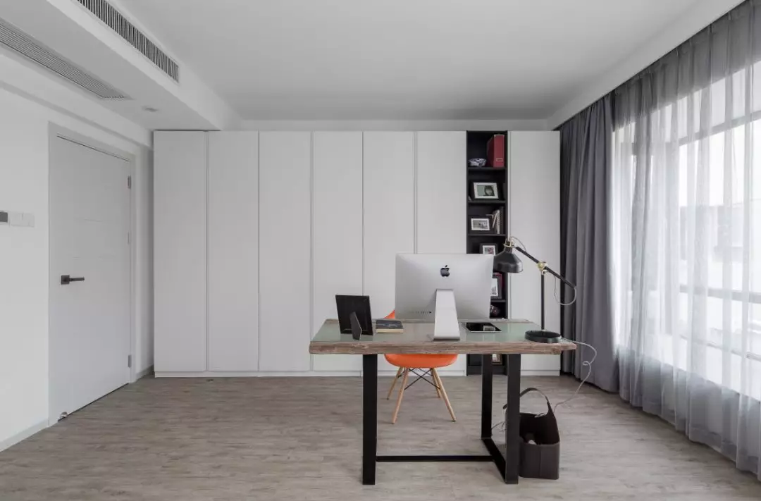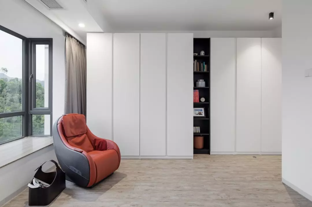 在大面積溫潤中和的暖木調(diào)地板中,干凈利落的一片式衣柜,顯露出與眾不同的個性。設(shè)計師通過減少過多繁雜的室內(nèi)包裝設(shè)計,讓空間看起來更舒服簡潔,并且更有整體性。