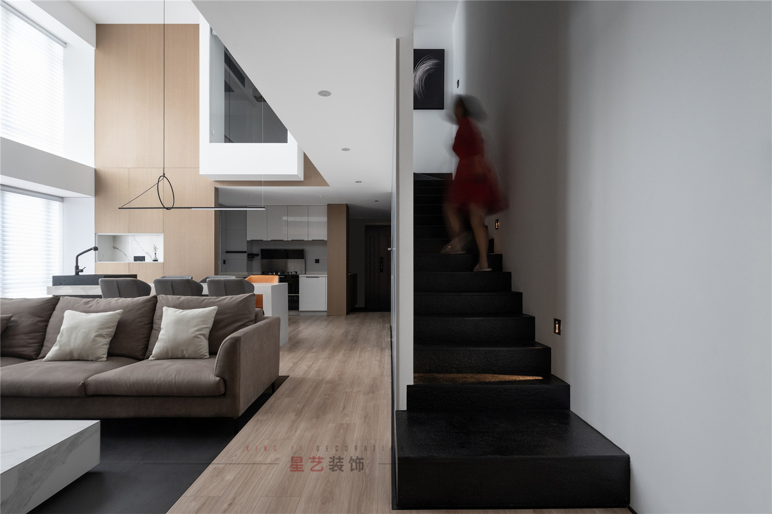 顯得有些朦朧的樓梯在客廳的視野中尤為特別,延伸的設計給增強了空間的層次關系,并且采用聲控燈,在黑色的臺階上灑下點點星河,每天都感受家居帶來的極致浪漫。