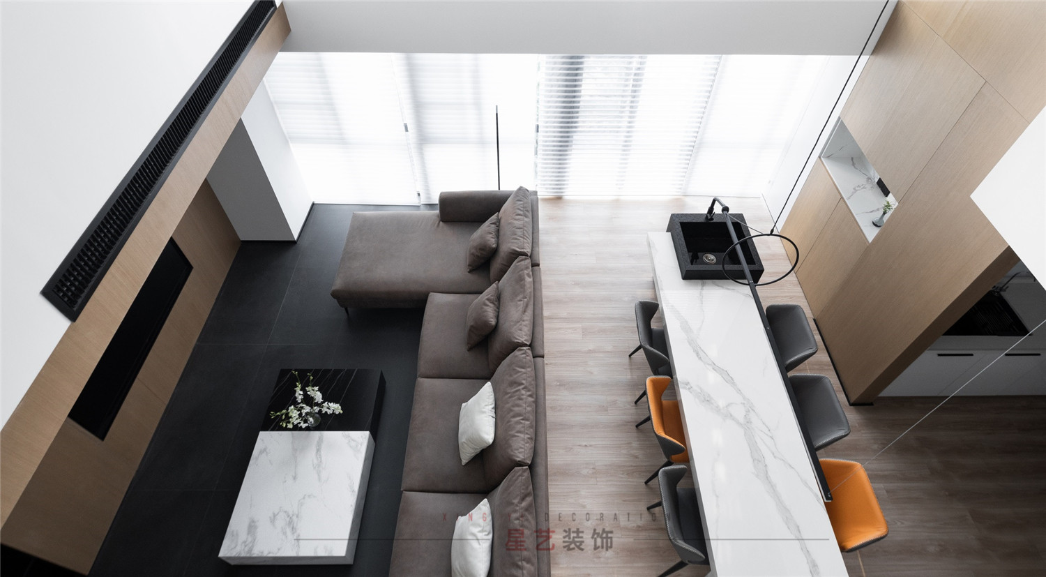 客廳:簡潔的設計,大面積的百葉窗制造極好的光影效果,不管任何天氣都擁有最佳的采光,內嵌的電視機搭配下沉式空間的處理手法帶給業主沉浸的舒適體驗,主色調黑白灰,在各個區域中都有獨立的對應系,精簡而規整,大方而得體。