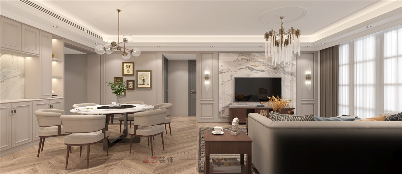 客廳作為主要的待客區(qū),進(jìn)了門(mén)就可以看到主要的休閑區(qū)和用餐區(qū),因?yàn)檎w空間上會(huì)比較低矮平和,所以在選材上也會(huì)偏向于舒適,柔軟,溫馨的材質(zhì)組合,可以建立出溫馨的家庭氛圍,兩種的不同精致華麗得吊燈也為客廳和用餐區(qū)劃分出區(qū)域。
