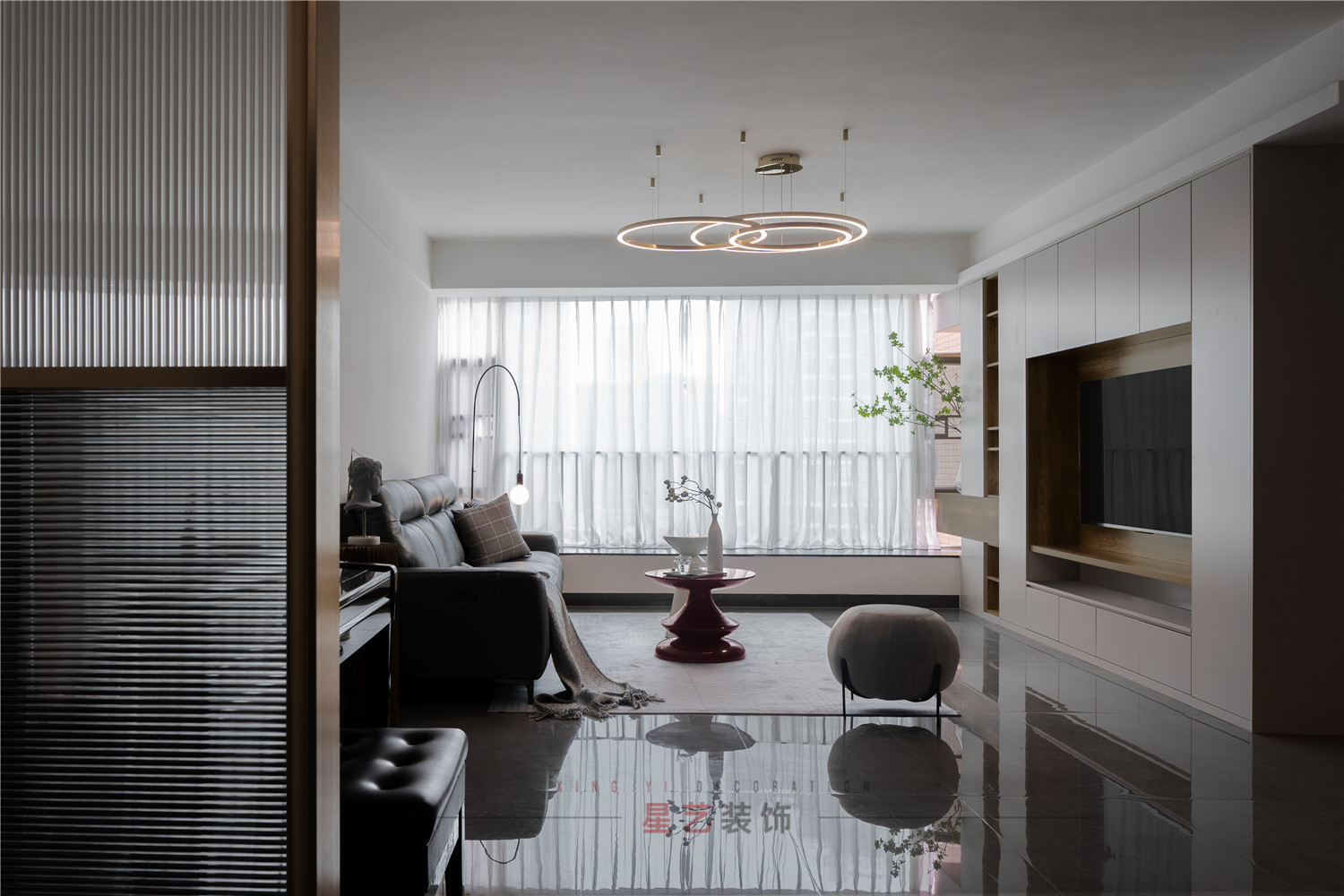 在客廳進門處巧妙的加上了玄關屏風,整體的材質也和整體的風格相得益彰,選用了金屬拉絲不銹鋼材質夾亞克力玻璃做拉斯處理。
