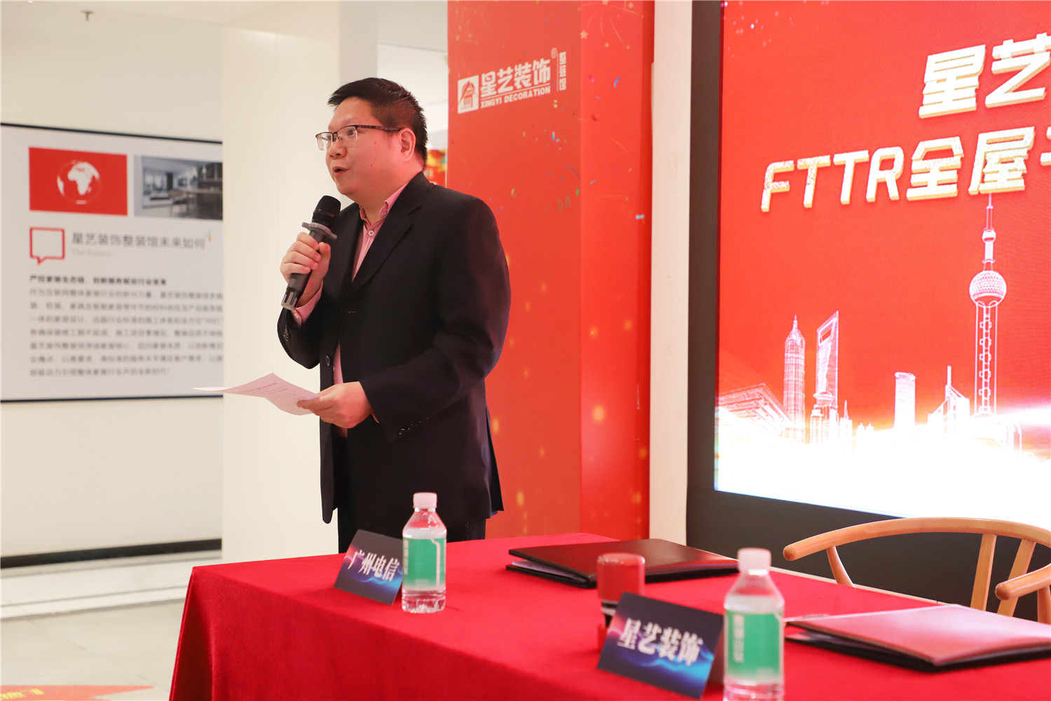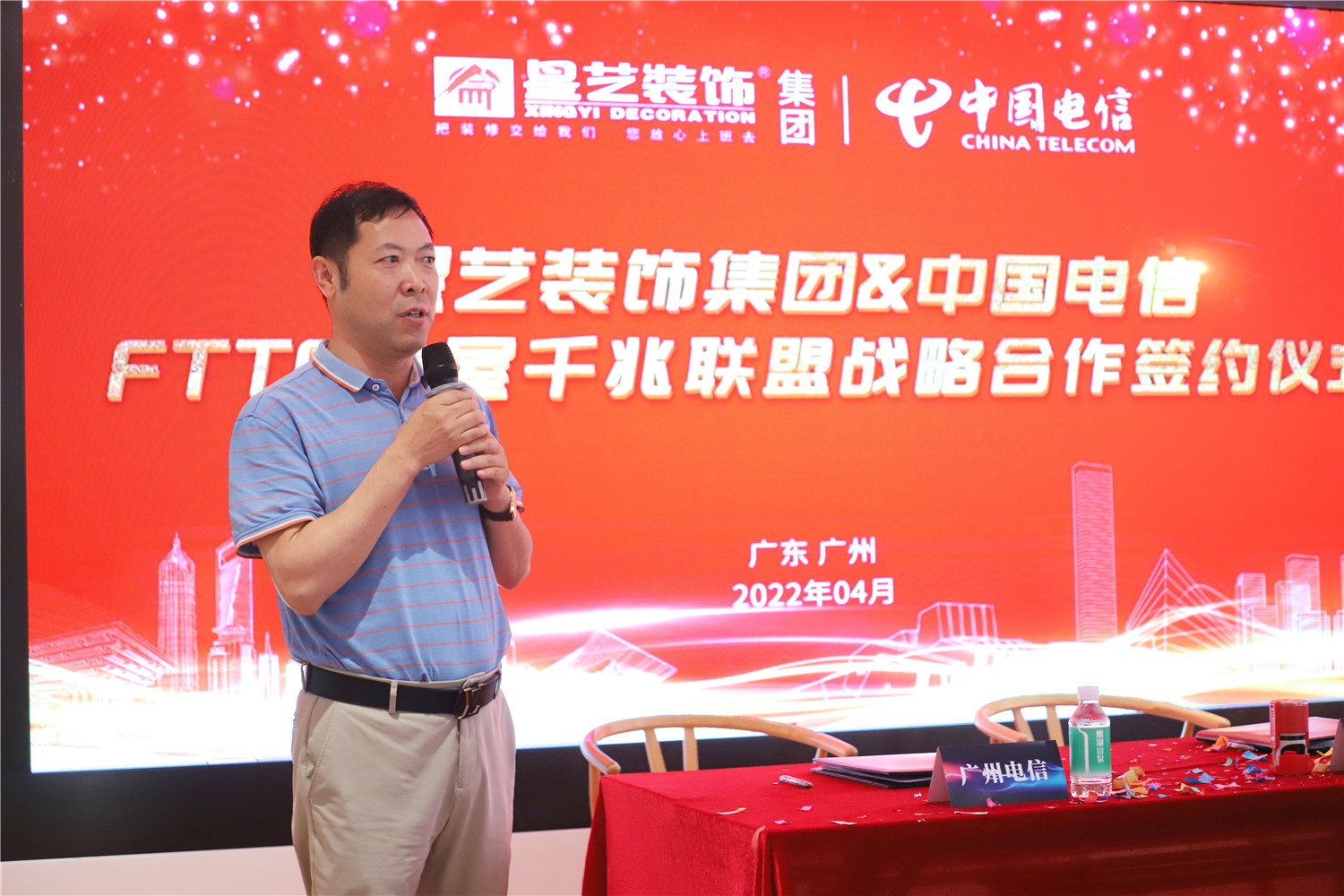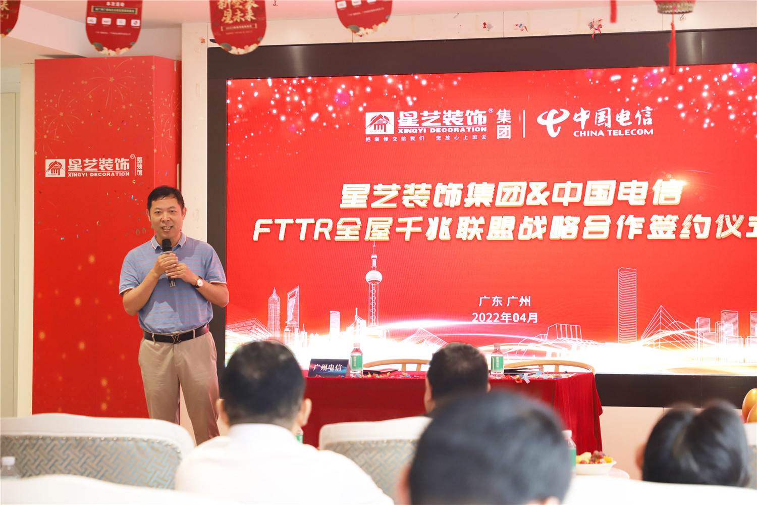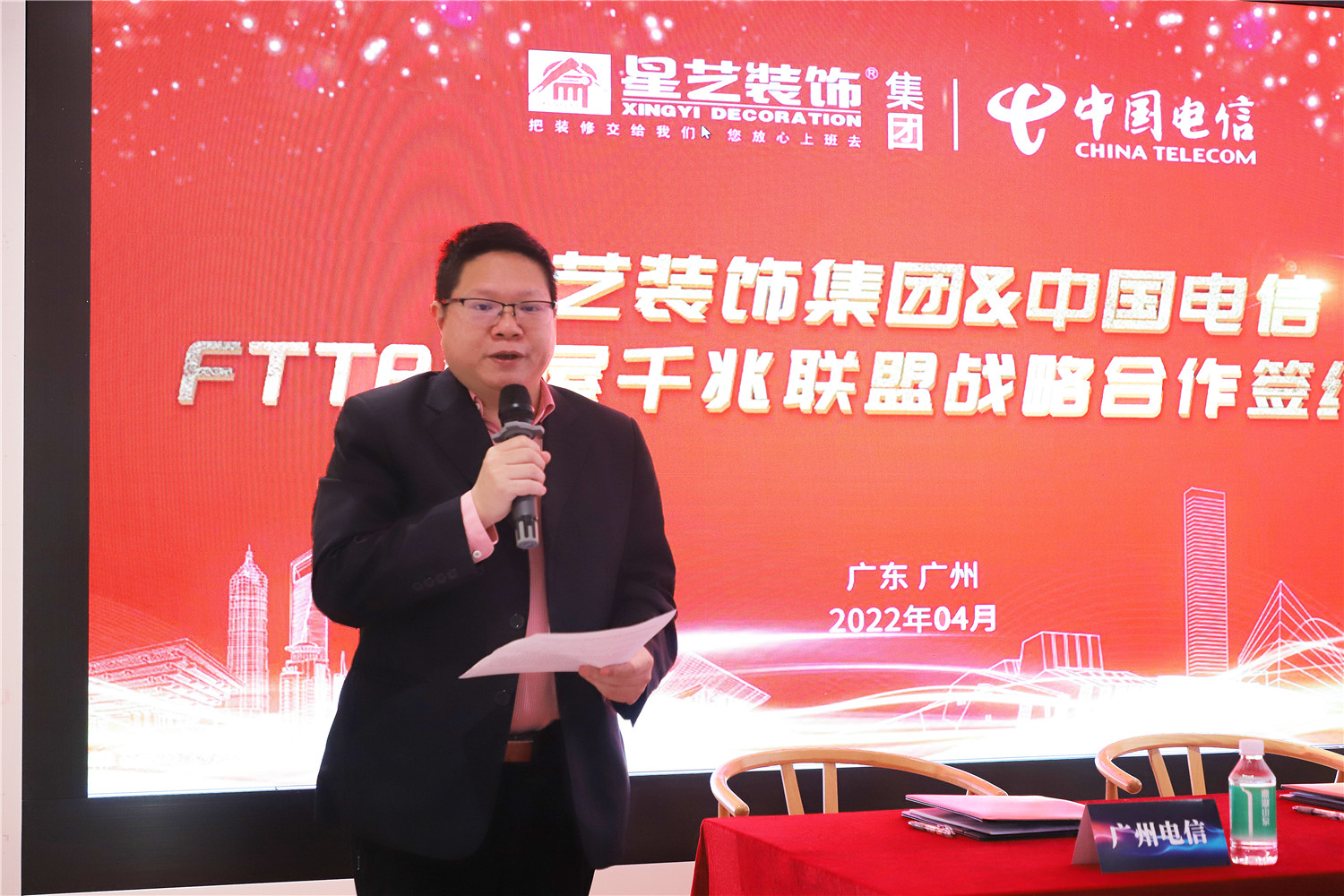 簽約儀式現(xiàn)場,星藝裝飾廣州分公司總經(jīng)理柯志強、星藝裝飾廣州分公司副總經(jīng)理劉亦萍,中國電信廣州分公司關(guān)堅成分別進行了致辭發(fā)言。