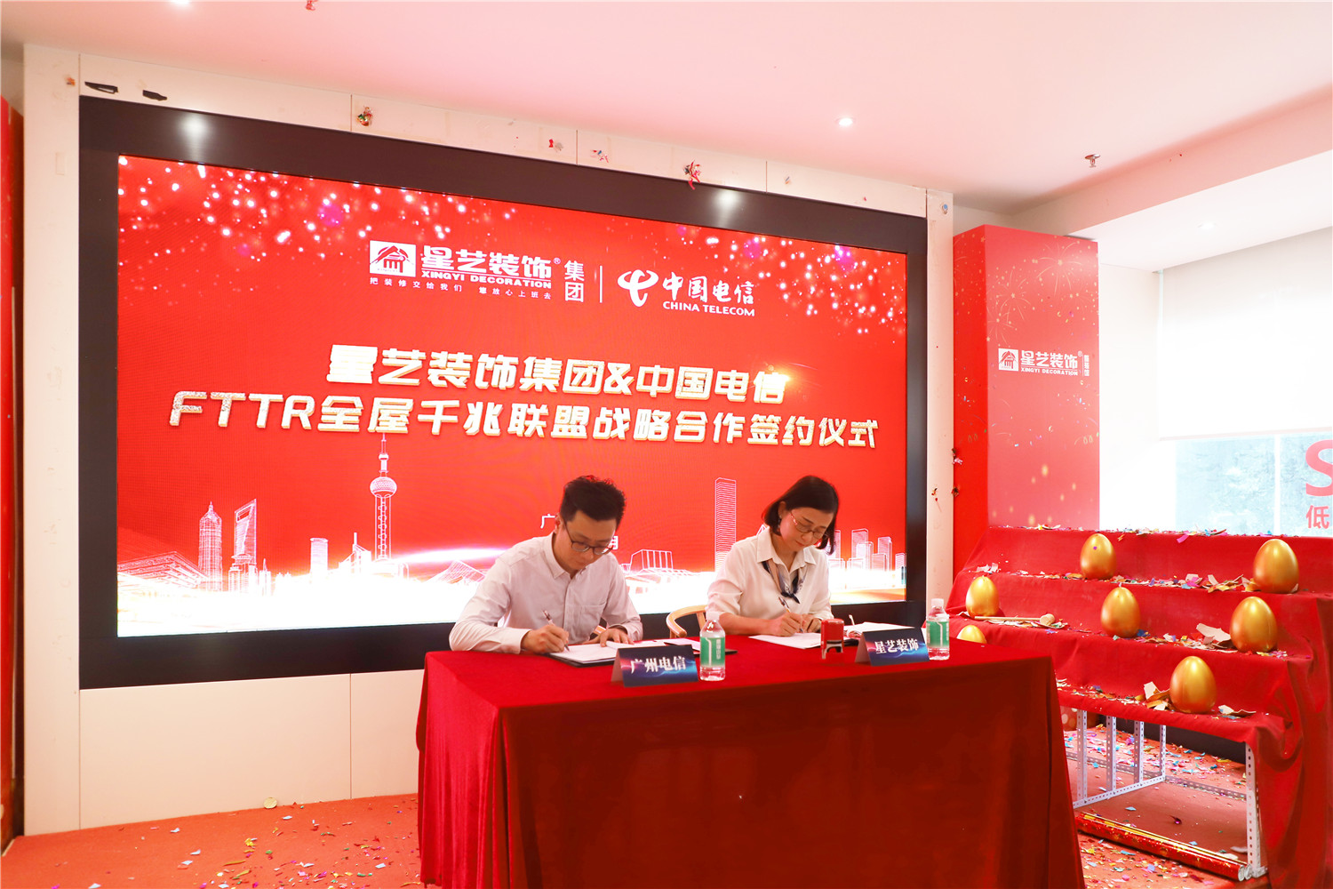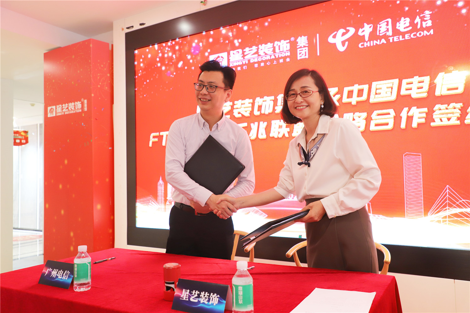 在現(xiàn)場嘉賓的共同見證下,星藝裝飾廣州分公司副總經(jīng)理劉亦萍和中國電信廣州分公司創(chuàng)新中心總經(jīng)理李應春代表雙方在戰(zhàn)略協(xié)議書上簽字,開啟了戰(zhàn)略合作的新篇章!