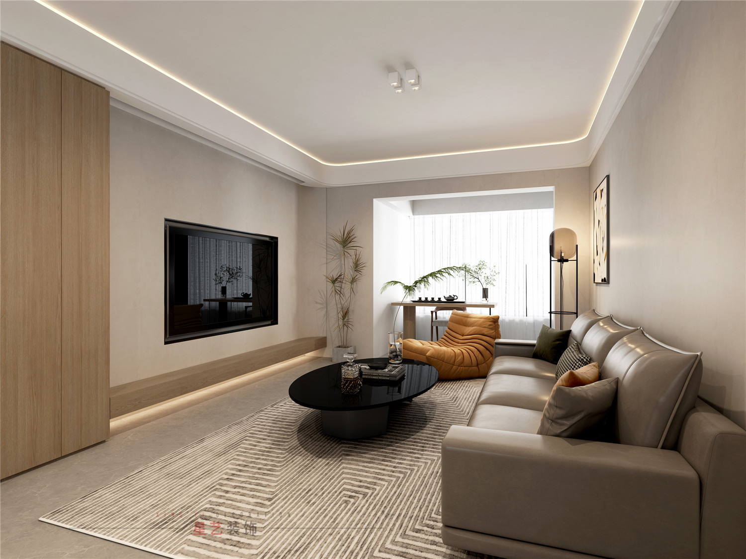 四季素淡,清淺而行。客廳總能集聚歡聲笑語,以米色為底色,簡單素凈,加以橘色沙發做點綴,如身臨一程秋色,撞進了秋的序幕;一盞茶,一首歌,舒適愜意,怡然自得。