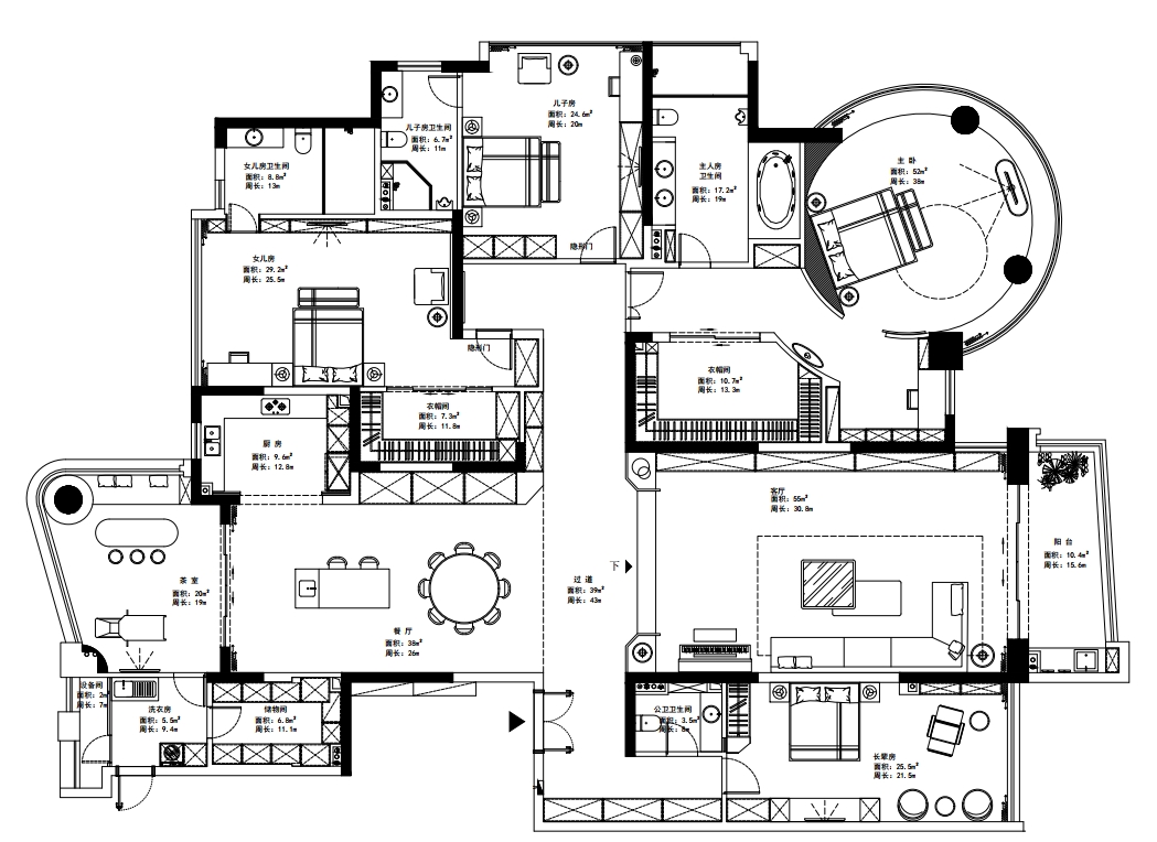 這套房子,是業(yè)主一家三代的主要生活場(chǎng)所。6口之家,空間功能的豐富性不能少,日常起居、大人辦公、全家觀影等需求一并滿足。
