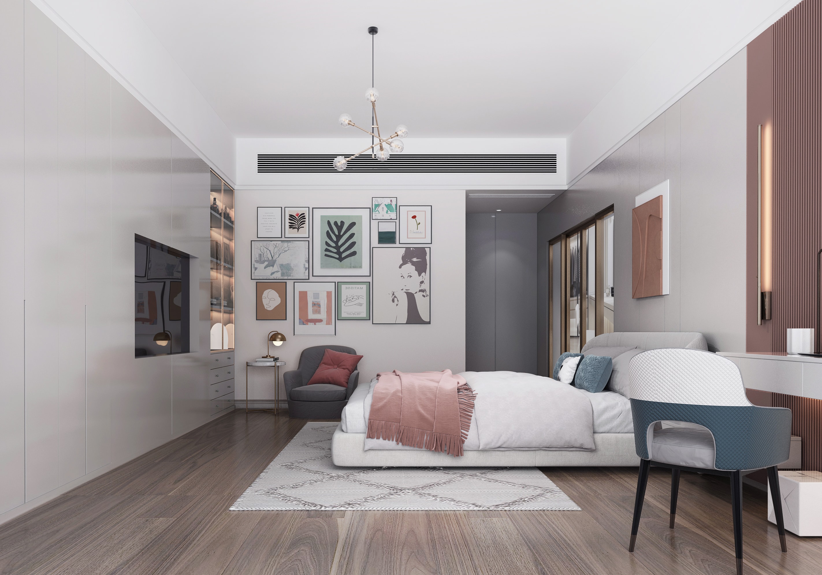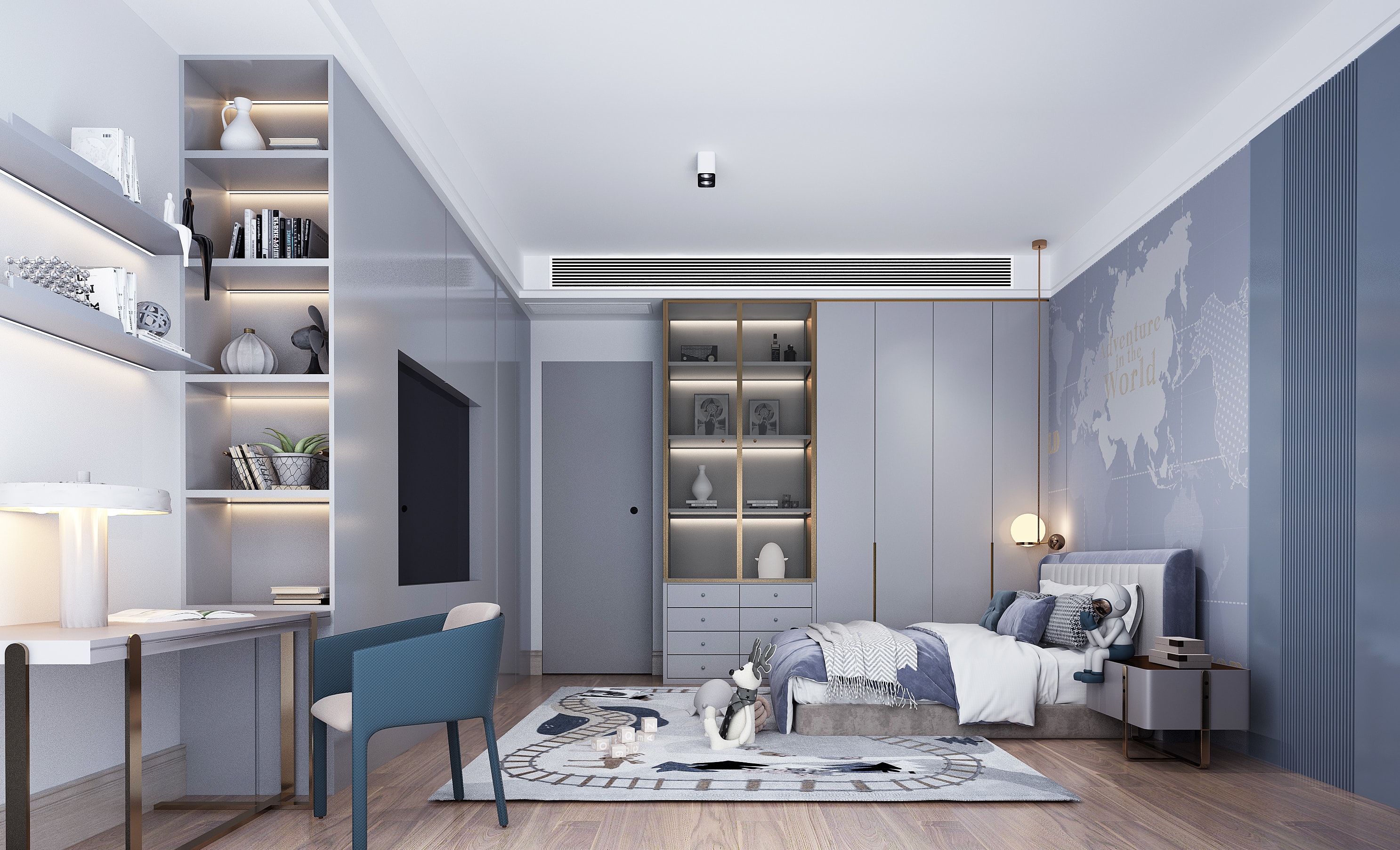 低飽和度的粉色和藍(lán)色的兒童房,沒有繁復(fù)的線條和切割造型,只在細(xì)節(jié)處做好陳設(shè),尊重時(shí)間、尊重成長(zhǎng)。